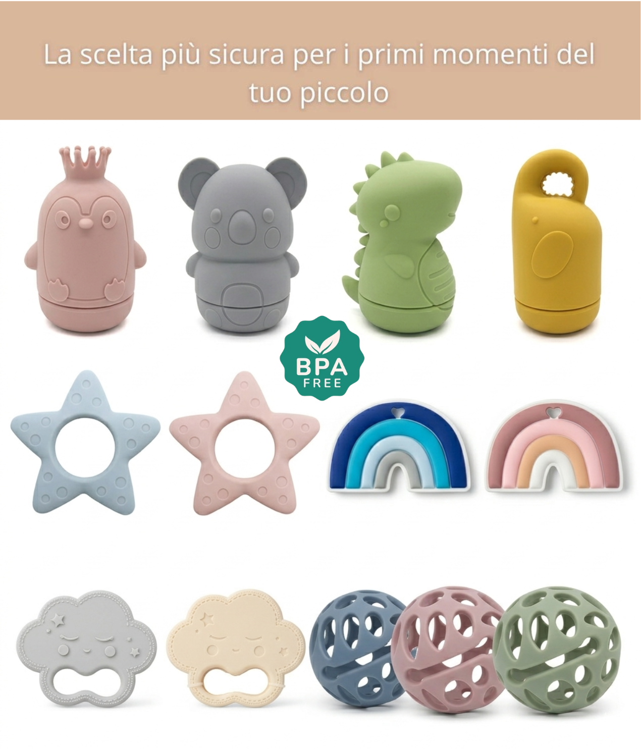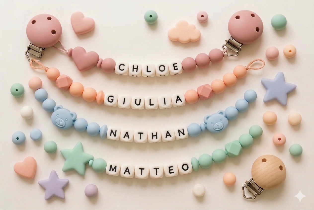 Realizzati in silicone alimentare e personalizzati per il tuo bambino. Un accessorio unico, igienico e sempre a portata di mano.
