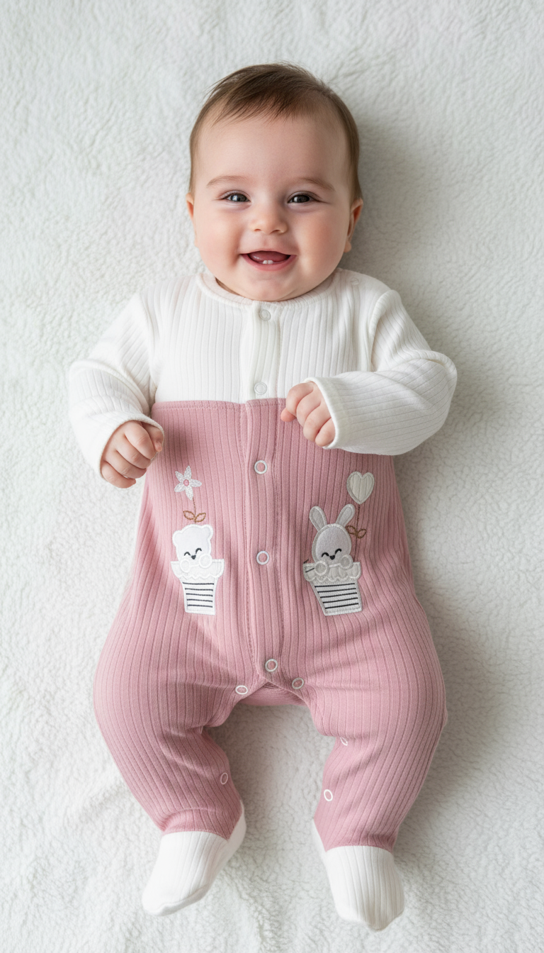 Morbida tutina per neonato in cotone costinato con adorabili applicazioni di coniglietto e cactus. Perfetta per il comfort quotidiano del tuo bambino.