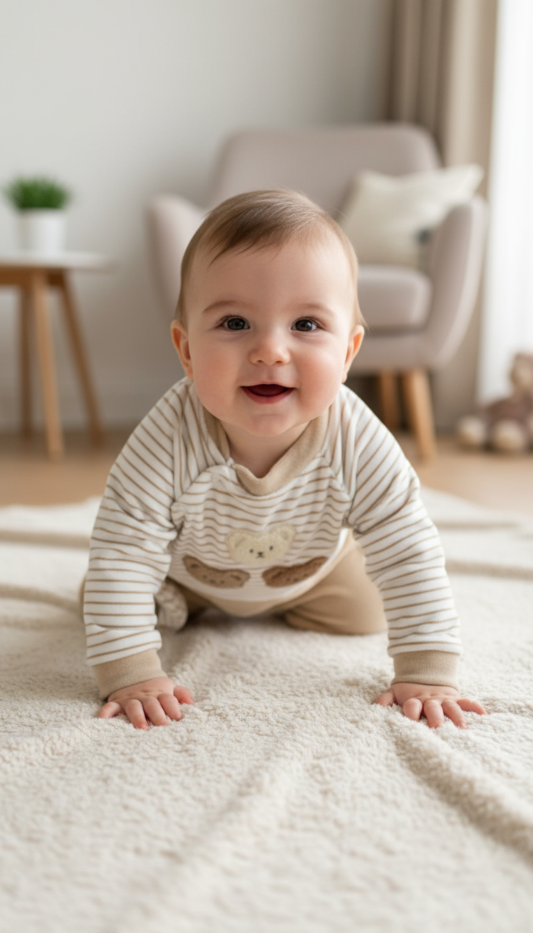 Elegante tutina per neonato a righe beige e bianche con adorabili applicazioni di tre orsetti. Un capo raffinato che unisce stile e comfort per il tuo bambino.