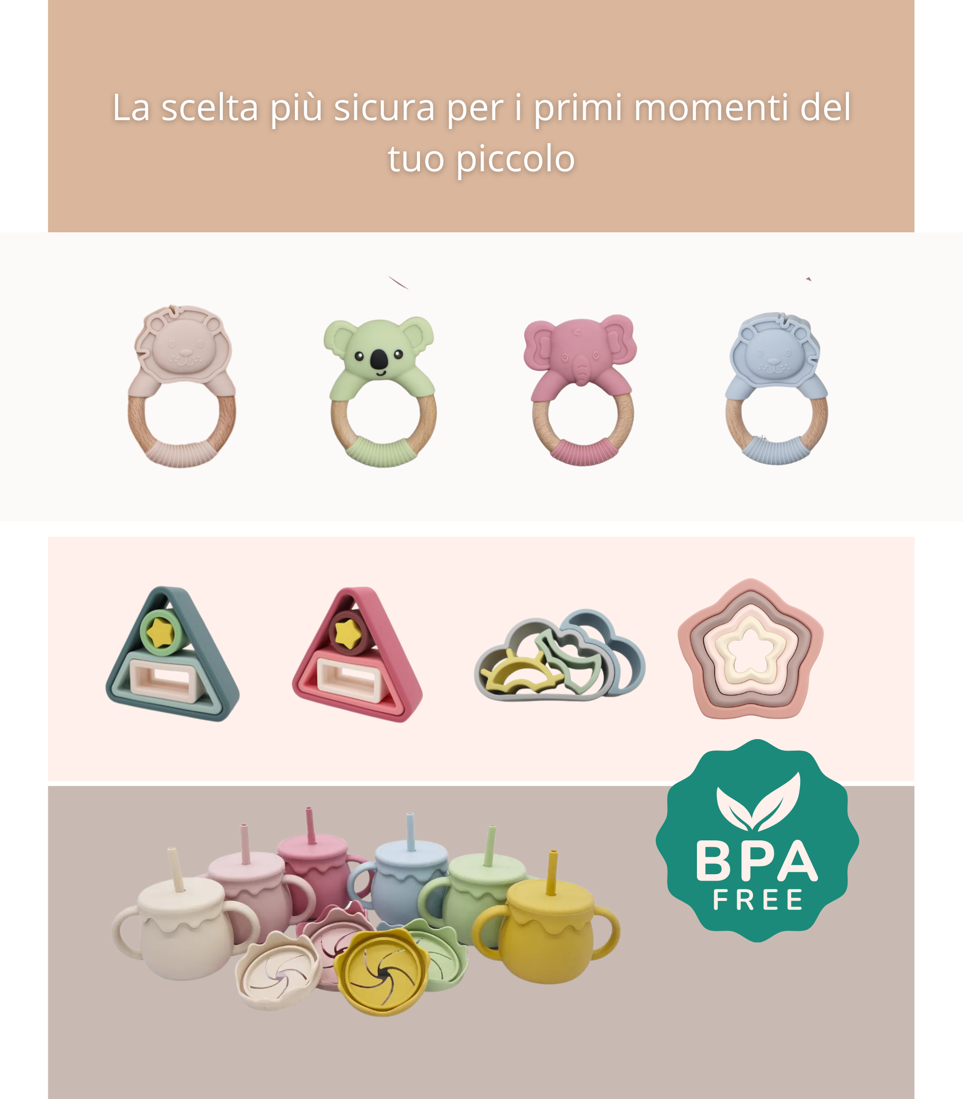 Realizzati in silicone alimentare e personalizzati per il tuo bambino. Un accessorio unico, igienico e sempre a portata di mano.